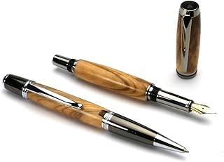 Schreibset Füller / Kugelschreiber - handgedrechselt aus Olive Holz mit verchromten Metallteilen, jedes ein Unikat Einzelstück, mit Etui, Made in Germany