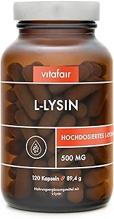 VITAFAIR L-Lysin (2000mg pro Tagesdosis) - Vegan, Braunglas, Ohne Zusatzstoffe, German Quality - Hochdosierte essentielle Aminosäure - 120 Kapseln