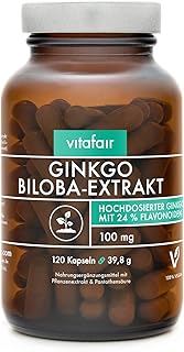 VITAFAIR Ginkgo Biloba (100mg pro Kapsel) - 120 Vegane Kapseln in Braunglas, Ohne Zusätze, German Quality - hochdosiert mit 24% Flavonoiden & 6% Pantothensäure - Extrakt - Gut verträglich