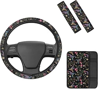 Belidome Auto-Lenkradbezug mit Kolibri-Motiv, mit Mittelkonsolen-Polster, bequemer Gurtschutz, rutschfest, langlebig, universelle Passform